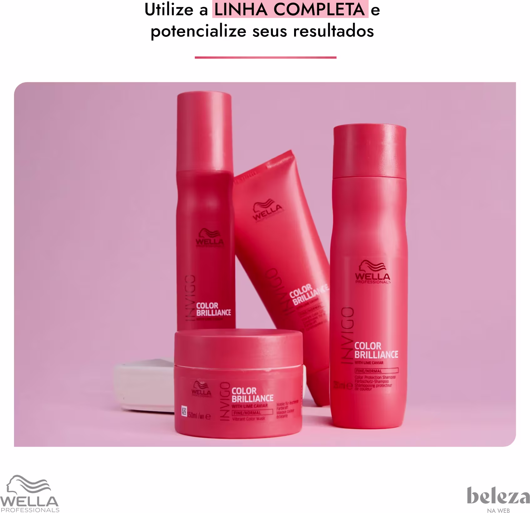 Com mais de 130 anos no mercado, e com origem alemã, Wella Professionals acompanha as tendências década após década e investe em estudos tecnológicos para estar sempre entre as maiores. A marca cuida do cabelo colorido, loiro, oleoso, sem vida, ressecado, envelhecido e com química ou alisamento. Com ativos poderosos, revitaliza a saúde capilar e recupera a beleza, o brilho, a maciez e o movimento dos fios. Há cem anos, a marca inova a cada dia para atender sempre e com mais atenção as suas clientes.
