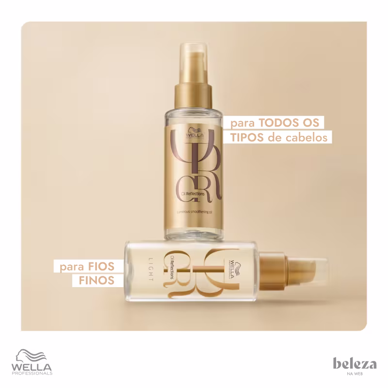 Óleo para todos os tipos de cabelos, especialmente finos. Wella Professionals Oil Reflections Light nutre instantemente os fios, sem pesar, com efeito luminoso.