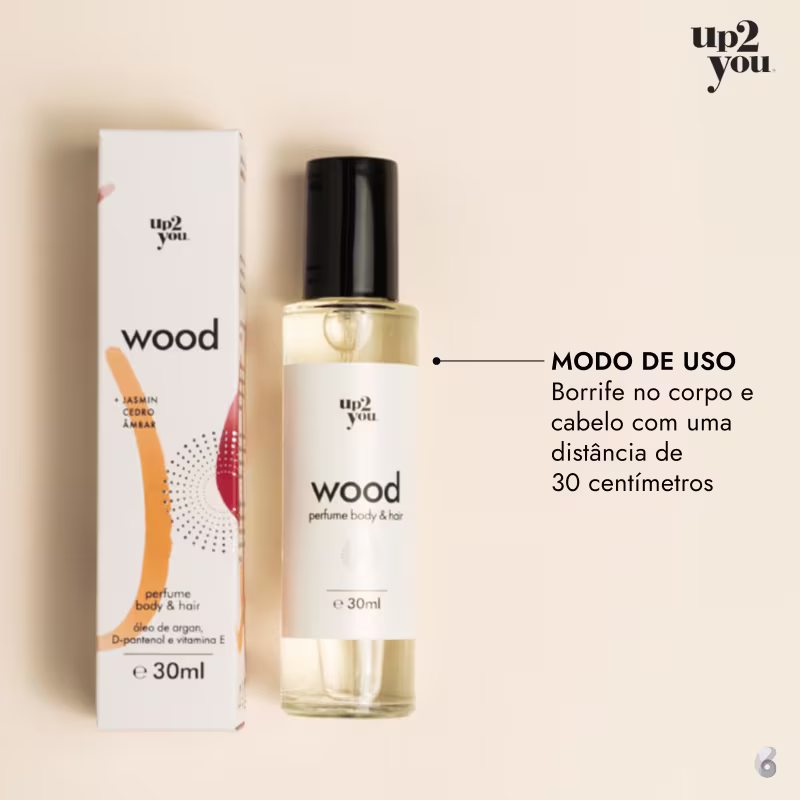 Wood é um perfume para corpo e cabelo, de Up2You. Fragrância amadeirada envolvente e sofisticada, que confere uma presença marcante por onde você passar.