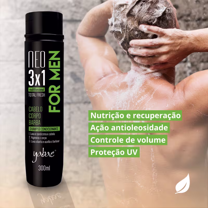 Shampoo masculino multifuncional. Yabae Neo For Men é ideal para cuidar dos cabelos, corpo e barba.