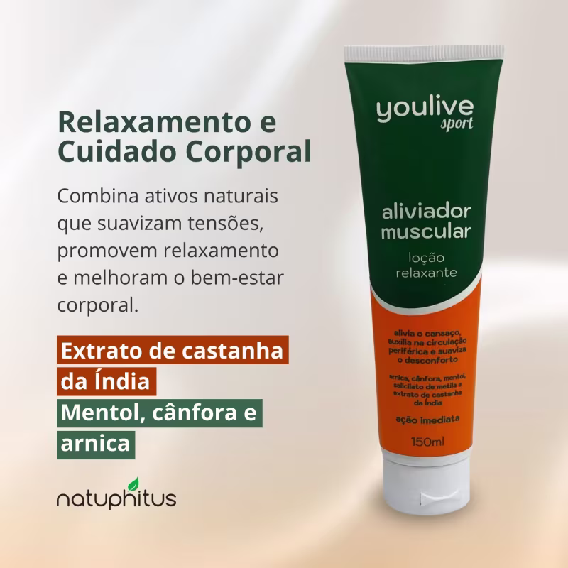 A Loção Corporal Relaxante youlive Sport Aliviador Muscular combina Arnica, Cânfora, Mentol, Salicilato de Metila e Extrato de Castanha da Índia, ingredientes reconhecidos por suas propriedades calmantes e revigorantes. Ideal para massagens corporais, o produto ajuda a aliviar o cansaço, estimular a circulação periférica e suavizar o desconforto causado por tensão muscular, fadiga, atividades físicas ou pelo uso prolongado de calçados. Pode ser aplicado em diferentes regiões do corpo, oferecendo ação imediata e sensação de alívio.