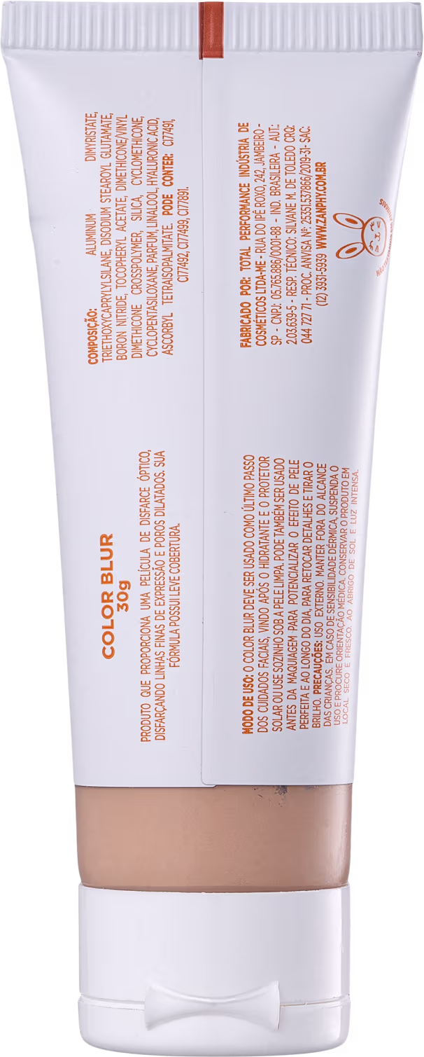 Base com acabamento matte e efeito blur. Zanphy Color Blur disfarça linhas finas, melhora a aparência dos poros e uniformiza a textura e os tons da pele, além de tratá-la de maneira profunda.
